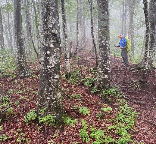 尾根筋に出るが右も左もガスガスガス。展望皆無。花もあまり無い。でも、ブナ林がきれい。霞んでいるブナが、深山幽谷のような分囲気を醸し出してくれる。幻想的だ。こんなブナ林も素敵。仙人が住んでいるのかな?