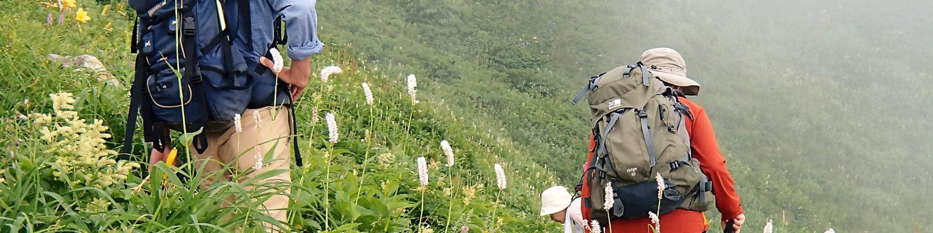 2010年に一度、今回は2度目の白山でした。白山と言えばお花の名前の前に「ハクサン・・・」と名づけられることが多いのですが、その名の通り夏は山一面にたくさんのお花が咲いています。また一年の半分以上が雪に覆われていて、その容姿はどこから見ても美しく神秘的で、誰もが一度は登ってみたい山のひとつです。しかし、山の魅力もさることながら、私が白山のある石川県に寄せる思いはもっと他にあります。と言うのは元大宮労山会員のY夫妻が20年ほど前に石川県に転居し定住しているからです。Y夫妻から度々「白山にお出で下さい」というお誘いがありましたが、なかなかそのチャンスが無く、ようやくここ数年に2回も登ることが出来ました。1度目はY夫妻に案内して頂き一緒に頂上まで登ることができました。今回は山の仲間4人での山行でした。Y夫妻とは大宮労山では短い期間でしたが、5月の越後駒にテントを担いで登ったことなど懐かしい思い出があります。