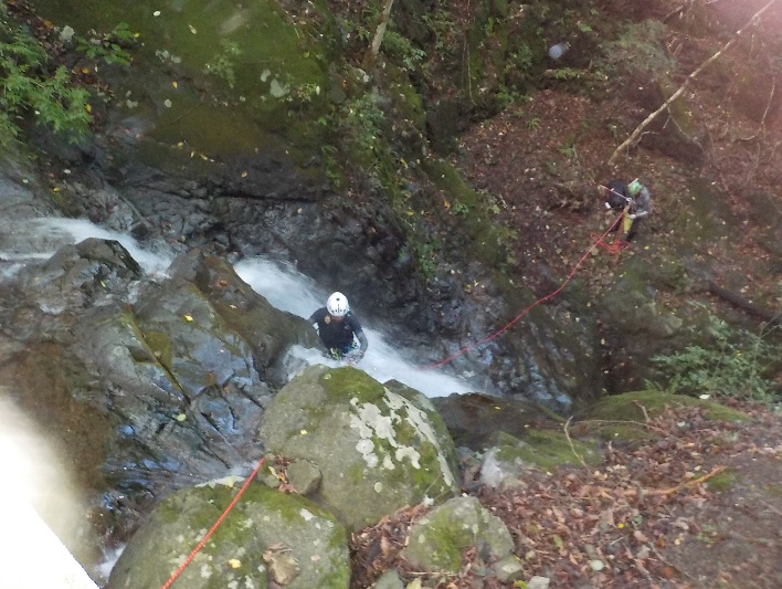 前日の雨の影響もありかなり音を立てて勢いよく流れています。ここは左岸から滝を下部でトラバースして直登するルートで登攀しました。トラバースの所が滝を浴びながら渡らなくてはならなくて、ただでさえ足元が見ずなんともツルツルしてとてもスベリそ~な岩に足を置かなくてはならない所が今回一番緊張した瞬間でした。唯一自分だけがラバーソールだったのもあって怖さ倍増でした。上部の方は下から見た感じでは俺(🔰)いけるか?という感じでしたが意外と手はしっかりしていたので大丈夫でした。
