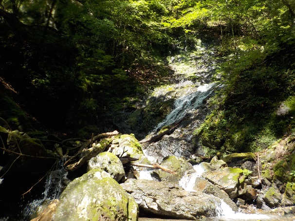 その後、木漏れ日射すきれいななめ滝が現れました。あまりにもきれいだったので気を取られていたらその手前の緩い一枚岩斜面で転びそうになりました。そう言えば歩きはじめの林道の会話の中で『ラバーは0か10だよ』と言われた意味が良く分かりました。