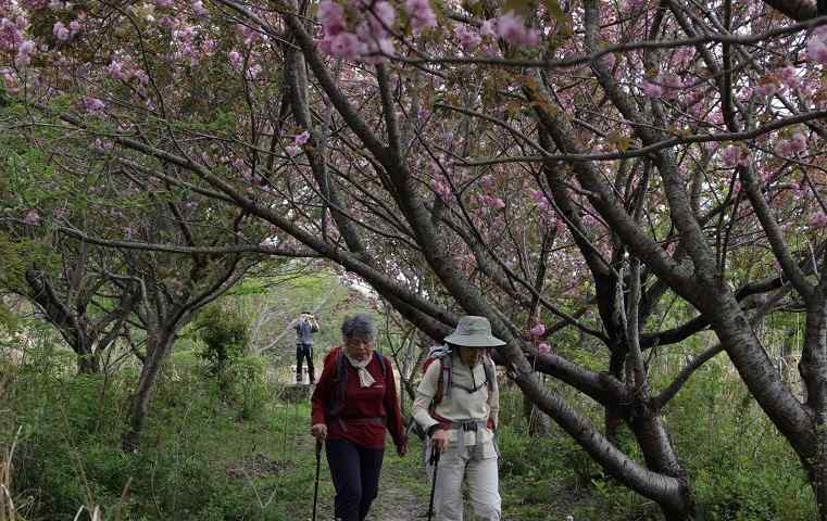 稜線には樹々の新緑に交り、山桜がほんの少しだが所々咲いている。新緑の葉に集る毛虫類を狙っているのかひっきりなしに鳥の囀りが耳に入り、長閑な稜線歩きとなる。雪入ふれあいの里に「雪入の野鳥達」の案内看板があったのが頷ける。しかしウグイスしか分からない、K塚さんもK端さんもガビチョウの声が聞こえると言うが判別出来ない。