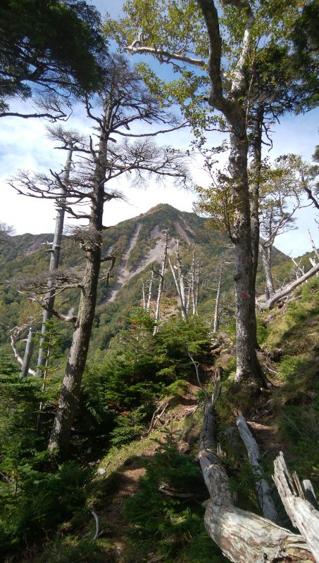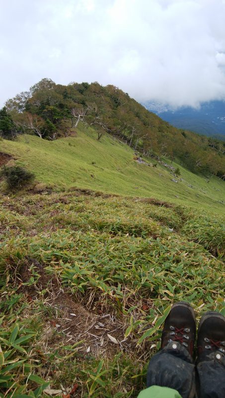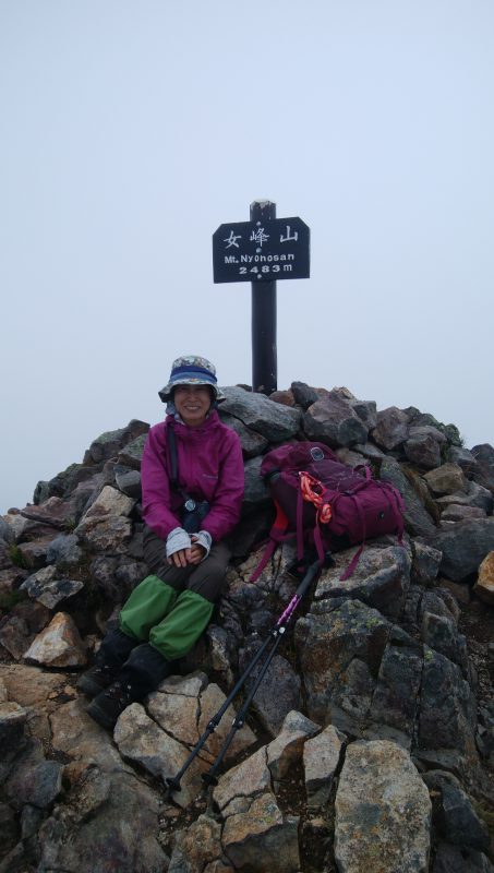 長く美しい尾根好きなK藤さんのお話と未経験の標高差に惹かれて登ってきた。二荒山神社の裏手の白糸の滝付近の駐車場から歩き始める。濡れて滑りやすい石畳の道の突き当り、行者堂に「女峰山」の標識を見つけた。ここから長い一本道の始まり。歩き始めは杉やヒノキの林が続き、次にツツジやシラカバが見え始める。平坦な登りを繰り返し、ガレ場のトラバースの先にやっと黒岩が見えてきた。お天気が良ければここから雲竜渓谷が覗けるようだが、今日は霧に隠れている。眺望も開け、左手はなだらかな笹原とダケカンバの林が美しい。急なガレ場を慎重に登り、唐沢小屋からさらに急登を登って山頂に到着。残念ながら周囲の山々は霧の中。幸運にも、下山途中で男体山や中禅寺湖が眺められた。雲と青空は秋の気配。2,3週間もすれば紅葉が美しい尾根になるだろう。登山者が少なく静かな山歩きが楽しめるが、登山道わきの笹は刈払いがされていませんでした。