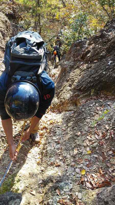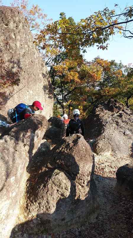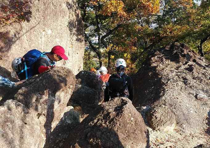 10時 岩山の途中で簡易ハーネス上下を装着後3班に分かれて練習開始
