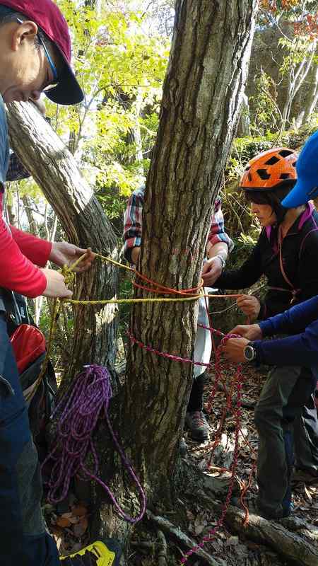 2.簡易ハーネスで半マストにての懸垂下降後フリクションノットで登る練習を実施