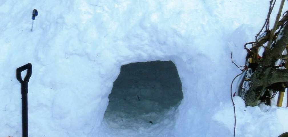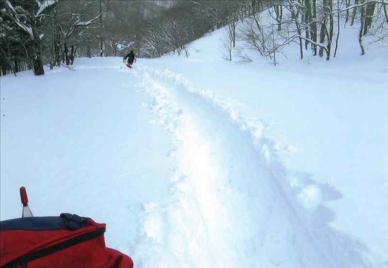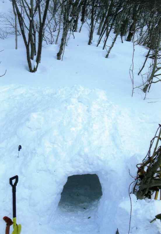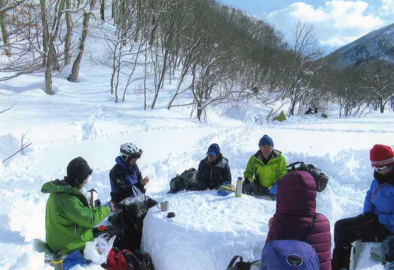 この頃には、風花が舞うが薄日が差す好条件になる。黄色の大型テントを張っているので、私は大事なトイレを作ってやることにした。赤沢山(1328m)の西側斜面際で、上部に大木が斜面に沿って続いている最も雪崩に安全な場所にした。女性会員も多いので入り口の狭いUの字形とし、ピッケルにシャベル(スノーアンカー兼用)をセットし、雪面を深さ1.5m程堀り下げ3段の階段で降りられるようにした。切り出した雪のブロックは、雪面から周囲を高さ0.3~0.8m程積み上げ、完全に周囲からは見えないものとした(所要時間約1時間)。この間、会員は、テント横に雪を固めた丸テーブル(直径1.5m程)と円形のベンチを作り、その後、2班に分かれ同斜面を利用し、雪洞造りに励んでいた。