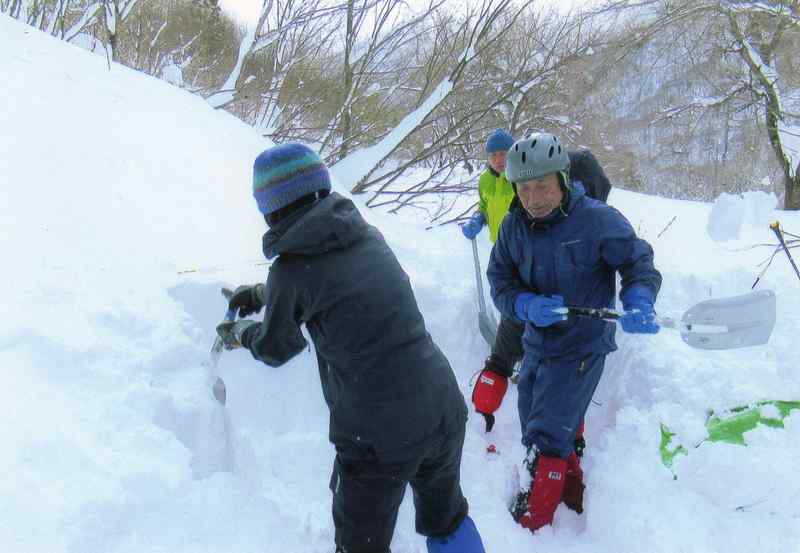風もほとんどなく、晴れ間の時間も長くなる14:00頃より、ビーコンワーク(雪崩救助訓練・・電波を送受信するアバランチトランシーバー<ビーコン>の習熟)が行われた。今のビーコンは埋没者までの方向・距離が示されるが、私が訓練した昔は、磁束線と音のみでした。格段の改良ですが種類が多種で・・。今回の方法は、3台のビーコンを予め埋めて置き(送信状態で表・裏・横向きに)、3人1組がサーチ(捜索モード)状態にして、埋没してあるビーコンをできるだけ早く探し当てる(一般的に15分以内)、習熟の訓練であった。