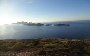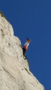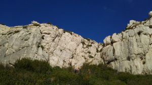 一番近場のカレロングの港めざし、路駐の中、車を南進。海沿いを15分走り、かわいい港に到着。駐車場よし。ネットで取り付き核心とけっこう書かれていたので、注意して登り始める。国立公園なのでトレッキングコースは整備されている。すぐに、稜線に出て、素晴らしい眺めが展開。岩壁は見えるけど、取り付きは? やっぱり迷って小一時間かかるが、無事に到着。わおっ、最高のロケーション!紺碧の海と青い空と白い岩。しかも誰もいない! ロシェデグーデ/フェイス サウス 石灰岩左から、A~Zルートが設定され、7・8本のプロテクション20m前後。終了点は縦に二か所、リングが一個。