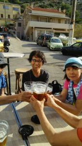 名残惜しみながら、下山。港のレストランのポーチで中ジョッキビール、皆で乾杯!