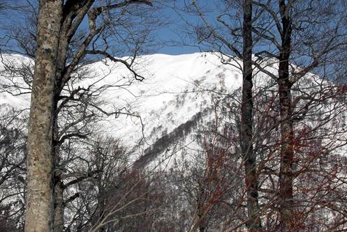 民宿を7:30に出た、チョッと遅い時間だ。昨日下見をした予定駐車場所はスノーシェットを境に前後はもう一杯だ。除雪で路肩が広くなった適当な場所に2台、1台あるいは3台と駐車している。少し離れ駐車し8:00頃出発だった。スノーシェットの南側平坦地から取り付き下大戸沢右岸沿いに進み30分くらいの適当な場所の急斜面からの登行だ。体が慣れるまで一息付きながらジグを切っての登行だ。1386m付近台地上の平地に出た11時頃だったろうか、また一本。この辺りも立派なブナ林が。木樹の間から三ッ石岳方向を望むが人影は見えず。上部から単独の男性が滑り降りて来た。聞くと上部でテント泊とか、昨日は矢張り天気が悪かったとか。それに比べ我々は軟弱だ、否それは私だけだが。よしこれからはガンガン行こう、と出発する3歩じゃ子供の頃飼っていた小動物と同じになってしまうので5歩も進むともうガンガンの思いはどっかへ滑って行ってしまった。私自信は登るより下り系が得意だ、第一に楽、兎に角ここは登らねば。下りより登りの方が良いと云う奴もいた。