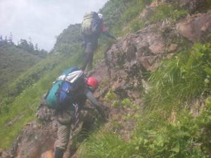 19日は登り始めて1時間もすると、青空が顔を覗かせてきた。美しい緑の源流となり、激しいやぶこぎとなってきました。9時20分順調に稜線に出た。しかしまたもや下山路に問題が出てきた。前武尊に看板が有り、「旭小屋へのコースにはクサリ場あり、一般登山者の下山は控えて下さい。」との事。我々は一般登山者ではないのだろうか?一般人だと思っているのだが。その難所のクサリ場を超えると、夕立ちがザッと降ってきてずぶ濡れとなった。旭小屋に着き今度は、長い道路歩きを覚悟して歩き始めた。ここでラッキーな事が起こったのです。キャンプ場管理人さんが、迎えに来て下さったのです。「大感謝」です。やはり計画書を渡しておいて良かった。(Hi・T記)