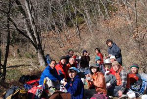 鍬柄岳には12年前の新年ハイクで来ました。その時には梅の木の枝落としをしていて、たくさんの蕾がついた木を持ち帰り、しばらく家中に梅の香りが漂っていました。今回梅の木はありませんでしたが、山は変わっていませんでした。前夜、疲れきって何も支度ができず、朝が心配でしたが、思い切って参加して本当によかったと思います。初めてのキムチ鍋の美味しいこと。電車の中で総勢19名がズラリと並び、酒を飲み、お菓子を食べ、何と楽しい一時でしょう。また来ましょうね。ちなみに、19名中5名が、12年前も参加していました。 (Na.G記)