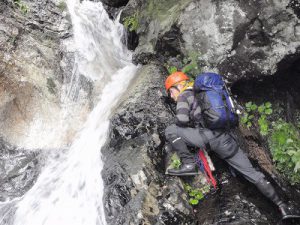 カドナミ沢は、土樽から向かいの荒沢山へ一気に詰め上がる沢で、どうも印象としては水が少なくルンゼを登るような印象を受けていたが、梅雨のこの時期は、水も多かった。カドナミ尾根への道を入ると小屋があり、その脇から入渓した。ゴーロの藪が続く。途中巨岩があり、上の方にはスズメバチの巣を除去した後が残っていた。両脇から張り出す枝を払いながら進む。左に岩がチョックした4m滝、大きな流木が立てかけられた3m滝を越えると、10m滝にでた。中間がいやらしいが、30mザイルを引いてリードをし、10mテープのフィックスに垂らして上がった。初めてのIさんも「ゴボウだ」と言いながらするする登ってくる。その後つづく滝がたのしい。2段7m滝、すり鉢状になった7m滝、さらに滑り台状の2条5m滝。どれも登れる。5m滝でNちゃんは足を滑らせ、釜に引きずり込まれ頭までぬらして喜んでいた。空が広がると、5:1の二俣にでた。雨はぽつぽつと降っている。さて、次は3段25mの滝である。下部はすり鉢状になっている。フリクションを効かせて試みるがあがれず、左から登り、中断から戻ろうとしたが、上部は水が多く、シャワーであがるには厳しいと、その脇の灌木をつかみながらあがる。