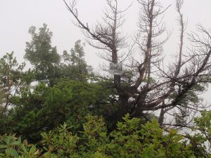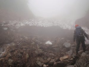 問題は、下山ルートだ。Nちゃんはもう終わりのような顔をしているが、辺りはガスで、眼下にあるはずの土樽駅や高速道路など何もみえない。下山のカドナミ尾根を確認しなければと、うろうろする。荒沢尾根は薄く見えるが、カドナミ尾根の分岐を探す。2人は荒沢山で休憩して体がすっかり冷えたようだ。もう、下界の暑さはない。まとわりつく関東の重い空気の記憶はなくなった。地図と方位を確認し、カドナミ尾根を下降する。尾根は急下降しているので、時折、枝尾根に入りそうになりながら、辺りを確認し下山する。