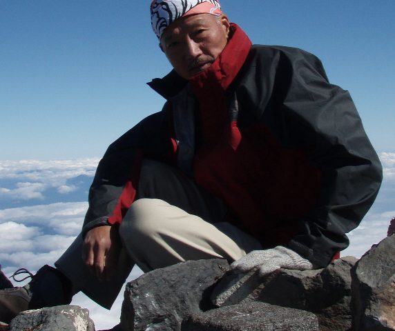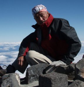 翌日5時10分に出発、途中雲海から顔を出す日の出を楽しむ。何度も登ったザレた登山道を上る。天気は非常に良い。3000mを過ぎる辺りから呼吸に注意しながら登る。出来るだけ口を開けないように鼻呼吸だけで登る。順調に高度を上げて山頂(久須志神社)に8時30分に到着する。約3時間20分で登ることが出来、以前と変わらなかったことで一安心する。休憩後白山岳へ向かう。一緒に6300m峰に登った岳友だが、十年前にこの富士山で高度順応時に逝かれた友の眠っていた場所でしばし黙祷、登るたびに彼女の屈託のない笑顔を思い出す。白山岳で暫くボーと過ごす。山頂で約一時間半過ごし、9時50分に下山開始をする。ザレた下山道をドンドン下る。佐藤小屋に11時20分着。テントを撤収してバス停に向かう。12時40分のバスで河口湖へ、河口湖駅前のホテルの風呂でさっぱりとする。駅前の食堂で打ち上げ、パキスタンのウルタルⅡ峰で亡くなった長谷川恒夫さんと顔見知りだったの食堂の女将と、長谷川さんが撮った写真を見ながらしばし歓談する。高速バスでまたもやお酒とうたた寝を楽しみながら帰る。