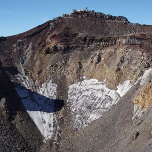 今月14日からのネパール写真山行の高順応ために七度目の富士山へ登る。今回はフレンチ・パス(峠)標高約5360mで三泊の予定で日程を決めている。天気予報と睨めっこしながら前日に日程を決めた。週末は五合目まで高速バスが運行されているが、その他の日は河口湖までで、バスを乗り換えて五合目に11時40分着。スバルラインの途中はガスで少々心配したが、五合目から上の方はガスが時たま出るものの晴れていた。観光客がウヨウヨしている中を素早く佐藤小屋向けて歩き始める。佐藤小屋は閉まっていたが、山頂を往復するには時間が遅いので、テント場にテントを設営してベンチで酒盛りを始める。