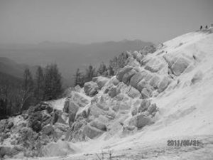 午後1時下山開始。錦滝コースを下る。いろいろな形の岩を見ながらの急勾配の下り。鎖、ロープ、鉄の階段、なかなか厳しい。これは初心者向きでない。錦滝まで40分。滝の所まで来て矢立石に戻るにはここから尾白川林道を2キロ歩く。途中花崗岩の土砂崩れで道がなくなり、崩落している真っ白な花崗岩の土砂の上を横切る。上から今にも土砂が押し寄せてきそうで、息を止めるように速足で通過した。これがもっとひどければ通過できない。この山を目指すには、前もって現地の役場に問い合わせた方がいい。