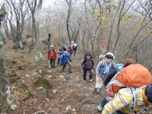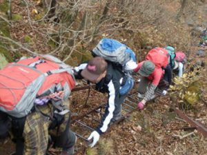 岩にハシゴにクサリ。雨も降り出し心配しましたが、皆さん無事に下山。ホッとしました。2時間と短い山行でしたが、雨でちょうどよかったのかな? けの汁も皆さんに好評で、私もおいしくいただきました。(Ma.S記)