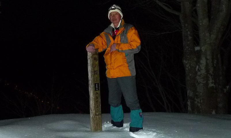 真っ暗の中、懐電を頼りに歩き始める。この雪で当然トレースはない。基本は尾根道なので尾根を外さないように登る。雪で隠れた登山道らしきところを探し、所々にある赤府・赤テープを確認しながら高度を上げていく。林道を横切り更に急坂を登る。稜線にでると冷たい風が辛い。雪も膝くらいまで積もっている。細い尾根を少し下り、左側が切れ落ちている急なガレ場(雪で詳細は不明)を登り山頂かと思いきや、山頂は更に奥にあった。一度下り登り返してだだっ広い山頂があった。6時頃到着。西側が開けていて、眼下に道志村や道志道の明かりが鮮やか、正面には夜明け前の富士山が望める。翌日の高指山での朝焼けチャンスが有るので、カメラ機材は持ち上げなかった。デジカメで記念写真を撮り下山を始める。途中で朝焼け前の薄ピンク色の幻想的な富士山を眺める。デジカメでは撮れない(写らない)。