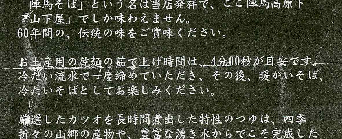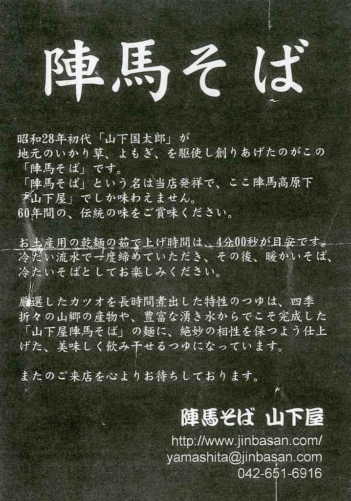 バス停前の「山下屋」生ビールでのどを潤し、ほっと一息。付き出しに出された「みそ」が絶品。塩分ひかえめ、ネギとノリのかかったなめみそ。つまみに注文した手作りこんにゃくもまた絶品。歯ごたえがよく、あのごっつい芋から手作りした感が充分。でも山下屋さんの本当の売りは「陣馬そば」。地元のいかり草、よもぎ入りの60年の伝統ある味だそうです。私たちは昼やじるしに食べた駅弁のとり飯弁当のお蔭でお腹がすかず、食べられませんでした。陣馬高原下に行った人は、バス一台送らせても、ご賞味あれ。