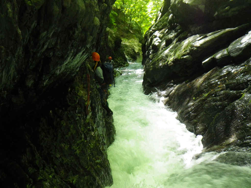 彼らを犬戻りの出口、坊主淵の手前で抜き、坊主淵も何とか泳いで突破。続く手取淵は幅2m、長さ30mの長い淵だ。左岸をずっとへつっていくが、最後の出口のところがホールドスタンス微少でちょっといやらしい。私はぶら下がっていたシュリンゲに全体重を預けて振り子トラバースの要領で何とか通過したが、S木さんはピタッと岩に張り付く感じのノーテンションで通過、さすが大宮労山の沢マスターである。。(写真3)