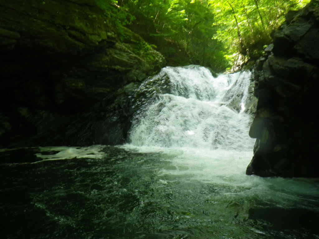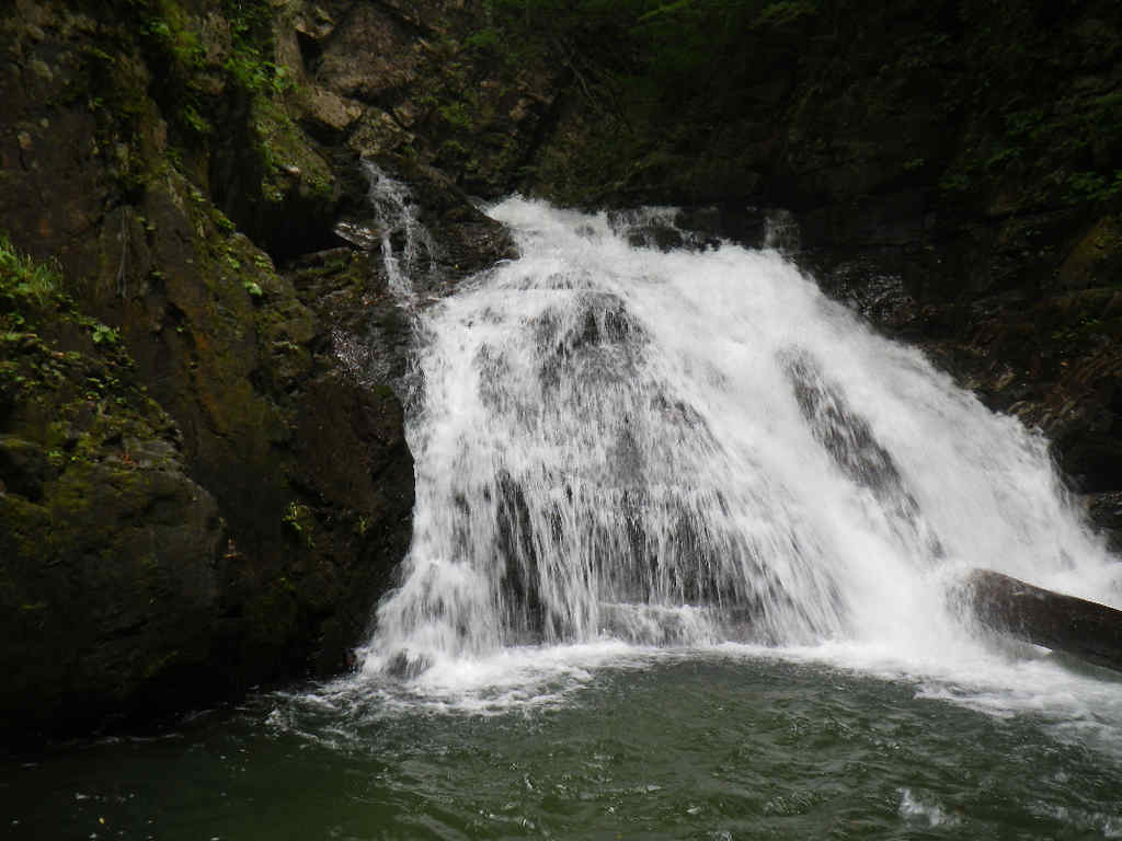 晴天続きのため、滅茶苦茶水が少ない。最初の淵もいつもだったら胸まで入るようだが、腰上で突破。振り返ってS木さんを撮したらズブズブ胸まで潜ったが、そんな水量ではない。。(写真1)よっぽどうれしかったのか、鈴木さんはラッコ泳ぎまで披露してくれた。(写真2)