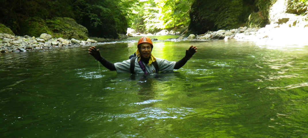 ピョンピョン河原を歩く感じで脚を進めると丸山入道淵15mが行く手を阻む。ここは水量穏やかなようだが結構な流れなのでストレートに右岸沿いを泳いでいたら一旦流されかかる。リトライして右岸沿いに泳ぎ、後ろを泳ぐS木さんに背中を押されてきつい流れの流芯を越え、若干流されつつも何とか右岸の岩に手が掛かりヤツメウナギ泳法で突破。今回はここが一番難しかった。(写真5)