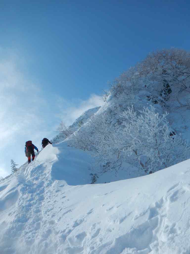 行者小屋に向かう登山道も適度に雪が積もっていて滑る心配がない。今回はベースを張ってのトライ。荷物を背負うのは若者ということで、背負えるだけいくらでも、と。それにしても山のような荷物になった。歩く途中で体を倒し、ストックで支えながら呼吸を整える。