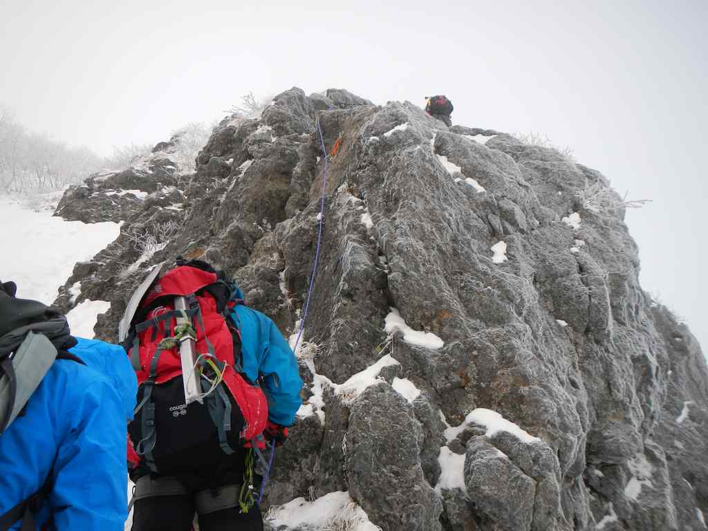 針葉樹林帯を抜け右の尾根に合流するとだんだん傾斜が立ってくる。第1岩峰の基部に着き、H竜さんとN川君がザイルをセットし始める。本チャンのビレイに慣れていないN川君はちょっと戸惑いながら、「セルフを外したよ」と言われてザイルをしっかり握リ直す。