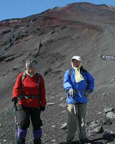 馬の背をめざすが、砂礫の登山道はきつくつらい。一歩上がるたびに半歩ずり落ちる感じである。山中湖が見えると聞いた馬の背にやっとたどり着くが、雲海が一面を覆い雲しか見えない。風も弱くならないので山頂は諦めて往路を引き返す。帰りは登りと異なり楽である。富士山には下山専用登山道があることがうなずける。