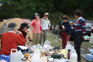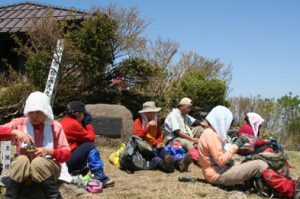 印元と厚揚げのスープ、餅入りだったっけ?他、パンなど。この日は八石山へ。この日も天気は快晴。登山途中、ピンク色の花びらが大きいシラネアオイが咲いていた。福田美子さんが「この花が見たくて登ったんだ!」と、とても嬉しそうに言っていた。八石山の頂上から米山がくっきりと見える。その頂上では、その日が八石山の山小屋開きのようで、ボランティアの方々が忙しそうに山小屋やトイレや神社の掃除をしていた。夜に雨が降った日があったが、昼間は天気に恵まれた3日間だった。ブヨが非常に多くて閉口した。新潟と聞いただけで雪深いと思い、完全装備で参加をしたものの、アイゼンを使う必要も全くなかった。米山に登る時に少し雪があったくらいで、大層楽しく山歩きができた。シラネアオイの花は初めて見た。4枚の花びらが菱形の形をしていて、鮮やかなピンク色。ちょうど満開時だった。