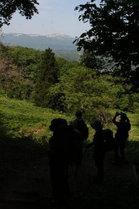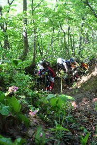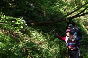『1科1属1種の正真正銘の日本固有種。しかも10cm近くにもなる大型の華麗な花(正確には萼片)が咲く、まさに日本を代表する植物といってよい』と、白根葵(シラネアオイ)が「山の花1200 (青山潤三著 (株)平凡社発行)」に紹介されている。残念ながら、関東近辺では高山に登らないとなかなか出会えない。地元柏崎市の地元のHPには、「白根葵が八国山(ハチコクサン)に群生し『八国牡丹』と言われて大事にされていたが、乱獲により激減してしまった」とある。有志により保護、植栽されたりしてかろうじて守られているらしい。八国山は標高518mで他の刈羽三山の米山993m、黒姫山891mに比べれば低い。ガイドブックにも紹介されておらず、1/25000地図にも登山道などの記載もない。地元の『八国の自然を守り親しむ会』作成の地図を送付してもらった。中腹の桐が3・4本植えられている場所には「カヤカリ場」跡があり、実を着けたたくさんの片栗や菫類、三葉土栗(ミツバツチグリ)等を見ることが出来る。里山である、正確には里山であったと書くべきか? 茅葺きの家はもうないそうであり、今は利用していないとのこと。コシヒカリの本場だけに休耕田はほとんどないが落葉の堆肥作りもしていないだろう。朴乃木(ホオノキ)には花が咲いている、その朴葉も今は料理には使われていないと思われる。標識・案内板もあり、登山道は整備されており道迷いの心配もない。積雪も見当たらない。当日も地元の方による登山道、小屋等の保守点検がなされ、山頂の神社も雪避けの板を取り除いていた。青々とした木々の葉や群生する白い二輪草の花の中に咲き誇った八国牡丹は、数は少ないながらも私たちを癒してくれた。他にも多くの種類の花に巡り会えた。現状の姿は、地元の『八国の自然を守り親しむ会』等のボランティアの方の多大な貢献のお陰と想像できる。いくら感謝しても感謝しきれない。