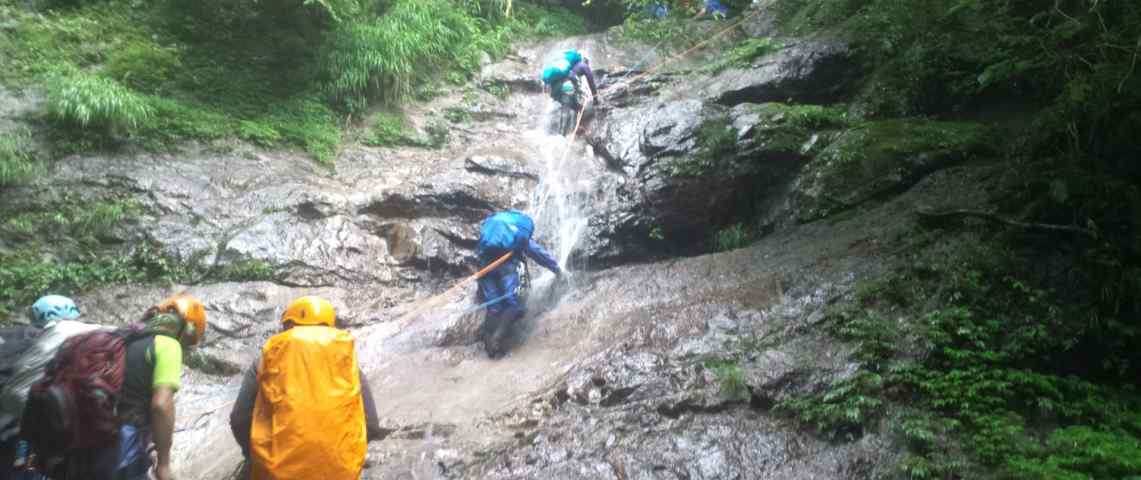 山行報告:大田山の会(東京都労山)の公開山行に参加させて頂き、丹沢・権現山のマス キ嵐沢に行きました。ガイドブックには「初心者入門コース」と書いてあったので、安心 して参加申込をしたのですが、すごい滝がいっぱいあり、「楽しかった」のと「怖かった」 のを一緒に味わうことが出来ました。 天気予報は雨だったので中止かな?残念だな。と思っていると、「雨の予報ですが、いず れにせよ沢で濡れるのだから明日は決行いたします」との連絡がリーダーから届いてバン ザイ。 荷造りを確認して、前夜は早く寝る。集合場所の新松田駅に遅刻しない様に、朝一番の 東武東上線に乗る為に 3 時に起きる。予定の電車に乗り少し早く集合場所に着くが、もう 数人が待っていてくれた。 バスは空いていて、直前に到着した人も全員座れた。真夏はもっと混むのかな?いや、 この天気予報だから登山者が少ないのだろう。大滝橋バス停留所から雨カッパを着て歩く が、入渓点まで歩くので汗びっしょりになった。濡れるのは覚悟の上だが、入渓前に「連 れて行くのはちょっと無理なので、ここでお帰り下さい」と言われない様に必死で歩いた。 「雨カッパは濡れても重くならないので沢で寒い時は着ると良い」との先輩のアドバイス を実践した、でも沢でやぶれると高くつくので百円ショップのビニールカッパを持参した のだが、今回はあまり寒く無かったので、入渓前に無駄に汗をかいたのと、休憩時の防寒 だけにしか、今回は役に立たなかった。 入渓点で、3パーティに分かれ入渓準備と、一般参加者の装備のチェックなどが行われ た。事前に配布された計画書にも記載されていたが、今日はタイブロックは必需品だった。 入渓してからすぐに滝が現れる。リーダーが「登れますか?大丈夫ですか」と心配して くれたので「ロープをお願いします」と言うと、滝の上から御助けひもを出してくれた。 いくつかの滝を越えると、すごく大きな滝が現れた。ガイドブックにより表現が違うが、 「2 段 10m」とか「2 段 15m」のスラブ状の滝だ。ここは各パーティで固定ロープを張り、 各自がタイブロックを装着して登った。私は途中で滑落するがタイブロックが効いて少し の滑落で済んだ。「滑るから注意して」と檄が飛ぶ。登り易い所を探しながらなんとか登り 切る。怪我は無かったが、心に大きな傷を負って登り続けると、6mスラブ状の滝で、滝上 から垂らしてくれたお助け紐を掴む直前で再び滑落し、滑り台の様に浅い滝壺に首まで浸 かった。「寒かったら、カッパを着れば」とやさしい声をかけて頂くが、寒さを感じる余裕 も無い。最後の 10m涸滝は、みんなは固定ロープにタイブロックで登ったが、私は怖いの で上からビレーしてもらい、必死で登る。 最後の滝を越えれば、詰めは短かった。尾根に這い上がる所が砂地獄の様に登り難く、 アドバイスをもらって木の根を掴み這い上がった。 権現山から畦ケ丸へ続く尾根を少し北に進み、小さなピークをひとつ越えた先に、右に 下りる道があった。道標はボロボロになっていて、支柱だけ立っているが、下り口に茶色 の土管に案内が書いてあった。この道は西沢から権現山に登る登山道だったが、危険なの で廃道になったらしい。だから道標も修理されないのだろう。一部、崩れて歩き難くなっ ている所があったが、大部分は歩き易い登山道だった。しかし、1時間足らずで標高差約 五百mを下るので脚にはきつかった。いつも「下山は慎重に」と心がけているが、特に沢 登りで怪我をしたら「何があった?」と大騒ぎになり、「下山中に転んだ」と知れようもの なら、「どうせ、気を抜いたのでろう」と叱責されるのは間違いない。いつも以上に慎重に 下った。その為か、西丹沢自然教室に到着したのはバス発車の 10 分前で、バタバタと着替 える事になってしまい、歩くのが遅くて大変申し訳ございませんでした。でも、帰りのバ スも全員座れて助かりました。そして何より、2回滑落するも怪我も無く無事下山出来、 良かったです。 今回参加させて頂いた、大田山の会の公開山行は、まず参加希望を連絡し、直前の例会 に出席し事前の説明を受け、一週間前に日和田山でクライミング・懸垂下降の練習をした うえでの本番の沢登りと、きわめて準備周到でした。「だれでも参加していいですよ」とい う案内を真に受けて参加させて頂きましたが、本音では新規会員の獲得が大きなねらいで しょうから、すでに他の会に所属している私が参加させて頂き、さらに足手まといとなり、 すみませんでした。お世話になりました大田山の会のみなさま、本当にありがとうござい ました。記:S.K