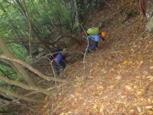 植 樹 の 次 の 日 、 5 0 の 山 の 狩 倉 山 に 行 っ て 来 た 。 登 山 道 は な い の で リ ー ダ ー が 地 形 図 に 引 い た ル ー ト を 歩 く 。 狩 倉 山 ま で は 急 で 、 根 っ こ を 掴 み 時 に は 四 足 で 登 る よ う な 斜 面 だ っ た 。 ル ー ト 通 り に 登 っ た つ も り だ が 、 違 っ て い る と 言 わ れ る と 地 図 読 み に 自 信 が な い の で 不 安 に な っ て し ま う 。 狩 倉 槍 は 岩 稜 帯 で 登 れ そ う な と こ ろ を 探 し 、 緊 張 感 が あ り 面 白 い と こ ろ だ っ た 。 両 神 山 に 登 っ た こ と が な い の で 、 頂 上 を 踏 ま せ て も ら い 最 短 ル ー ト で 無 事 下 山 。(記 H谷川)