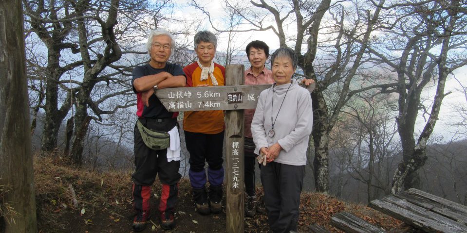 大きいピンクの沢山の葉が 少し黄色を含んで、昨夜来の 雨で輝きを増し、覗きかけた 青空から浮かび出ている。菰 釣山へ上がる道志川と三ケ瀬 川の間の尾根、1055mの 三角点から少し登ったところ で出会った紅葉だ。メンバー 全員が思わず「きれい!」と 声を上げた。 埼玉県勤労者山岳連盟中部 ブロックの読図学習山行、地 形図上、登山道のない尾根経 由で菰釣山を目指した。一行 は3山岳会8人。 地元を6: 30前後に出て、道 の駅「どうし」に9: 00集合。 9: 20歩き出した。読図が目的 だから、地図とコンパスで、 丁寧に現在地を確認しながら 進む。三ケ瀬川に沿った林道 を少し歩いた地点で尾根に取 り付いた。杉の植林の中、踏 み跡もないところを、めいめ い、歩きやすそうなところを 拾って登りだす。やがて、尾 根状の地形がはっきりしてき て、獣の踏み跡が確認できる。 1055m の三角点あたりか らは、人の踏み跡になった。 歩き易くなって、気楽になっ たところで、冒頭に記した樹 に出会った。そこで、昼食。 そこからも、踏み跡を頼り にすることなく、地形と地図 を照合させながら進む。やが て、急登になった。笹や木を つかんで体を持ち上げる。メ ンバーは経験豊か(高齢とも 言う)な山岳会員だから「オ モシレー」などとはしゃいで いる。標高差 50m程登り切っ たら、登山道に出て、東海自 然歩道へ導く標識があった。 今日初めての標識だ。さらに 30分余り進んで、 13: 40頂 上に着いた。 ひっそりした頂上を想像し ていた。古い丹沢のガイドブ ックに、「丹沢山塊でもっとも 登山者の訪れが少ない山域は 菰釣山である」とあるくらい だから。ところが、まず目に 入ったのが、頂上に似合わな い人工物の気象観測装置。結 構大きな容積で、一角を占領 している。さらに戴けないの が、工事を知らせる板。2m 四方以上ありそう。大きいテ ーブルも2つ。がっかりを通 り越して、幻滅する。救いは、 霧の切れ間から大きく高く姿 を現した富士。 山行中、他パーティの人に は一人も会わなかった。だか ら、一つの山で、「寂しい山に、 黙って登る」時間もとれたし、 一方、仲間と楽しく語りなが ら登る時間もとれた。古くか らの仲間は、そんな私の我儘 を自然体で受け入れてくれ、 仲間の温かさを感じる山行で もあった。 下山は、落ち葉の敷き詰め られた、三ケ瀬川沿いの少し 歩きにくい登山道を下った。 山行終了 16: 00。 なお、頂上から東に 30分ほ ど歩いたところにある避難小 屋は、機会があったら、ぜひ 一晩お世話になりたいと思う くらい、きれいに整備されて いた。 山梨・神奈川県境菰 こも 釣 つるし 山読図学習山行 仲間の暖かさを感じ O る 野和夫