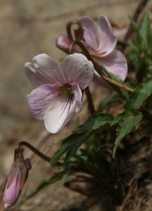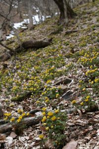 秩父大ドッケの『福寿草自 生地』へ地図とにらめっこを しながら、同行者に助けられ ながら行って来た。 2年前の秩父の大雪のさら に前に観に来ている。その2 年前の雪のためか、途中の作 業小屋や鹿避けネットなど崩 壊している。斜面も崩れてい る、崩れた斜面を慎重に横切 ると、そこには前には見つか らなかった叡山菫(エイザンスミレ) が咲いている。沢には雪も残 り多くの倒木が行く手を塞い でいる。 残雪も少なくなって来ると、 芽を出したばかりの紫の植物 が目に入る。『福寿草!』と思 ったが福寿草より猛毒の走野 老(ハシリドコロ) であり、福寿草を 私たち人間から遠ざけている。 福寿草は源流部に以前と同 じく、強かにひっそりと、青々 とした葉の先に黄色い花をつ け群生していた。想像してい たより人 間による 影響も雪 による被 害も少な かったよ うである。 木々はま だ芽吹い てはいないが曇り空で光が射 さないためか、時期的に早か ったのか、開ききった花は少 ない。 ここの福寿草はどうやって 世代交代し、増えるのだろう か?自家受粉なのか?寒いの か花粉を運ぶ昆虫は見当たら ない。根が延びてそこから新 しい芽が出てくるのだろう か?そうだとしたら訪れるこ とにより地面は踏み固まり、 根は伸びず増えないことにな ってしまう。実際、人間の踏 秩父大ドッケの福寿草自生地へ KT み跡であろう、小さなヘリポ ートのように裸地化した場所 には福寿草もその他の草木も ない。昆虫の媒介による受粉 としても、辺境の山中の隔離 された場所なのでここの個体 は遺伝子的にも差異が少なく 同じような性質で、種々雑多 な『多様性』でなく『単一性』 に近いと判断も出来る。 単一性であればウイル スなどが持ち込まれれば 一株も残らず全滅する恐 れもある。山梨県西桂町 の倉見山山麓の個人が育 てた熊谷草(クマガイソウ) は ハイカーの持ち込んだウ イルスが原因で、5万株 から5千株に(数値はう ろ覚え)大激減している。 今は靴底を洗浄してから 入園させている。 現代において、自然破 壊は地震・火山噴火や大 雪大雨等の自然災害より、 宅地化等の土地開発や排 ガス・原発放射能等私た ち人間活動による影響の 方が、はるかに大きいと確信 している。その大雪大雨など 温暖化の原因も元をたどれば 人間の生活や経済活動に起因 する。そして、生産した食物 の一部は食糧難の地域がある にも関わらずむごたらしいこ とに捨てられてもいる。生物 にとって最も嫌われる存在は 人間であろう。 帰り道の笹(スズタケ?と 言うらしい)は前回来た時は、 葉はなく茎のみで枯れていた が、今回は茎さえもなくなっ ている。しかし小さな若い笹 が散見出来る。笹は花が咲く と枯れると聞いたが世代交代 の時期なのだろうか?シー ドバンク(Seed bank) と言われ、 古代縄文時代の蓮の種子が芽 生えたように、以前あった他 の草木の種子が長い間の休眠 から目覚めて生えて来るのだ ろうか?どう遷移していくの であろうか?気になる。 ひっそり佇むニ十三夜塔は 秩父の自然を見守っている。(記 KT)