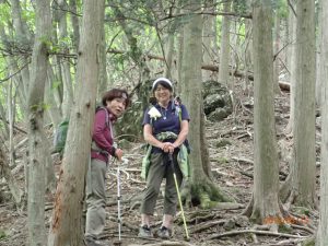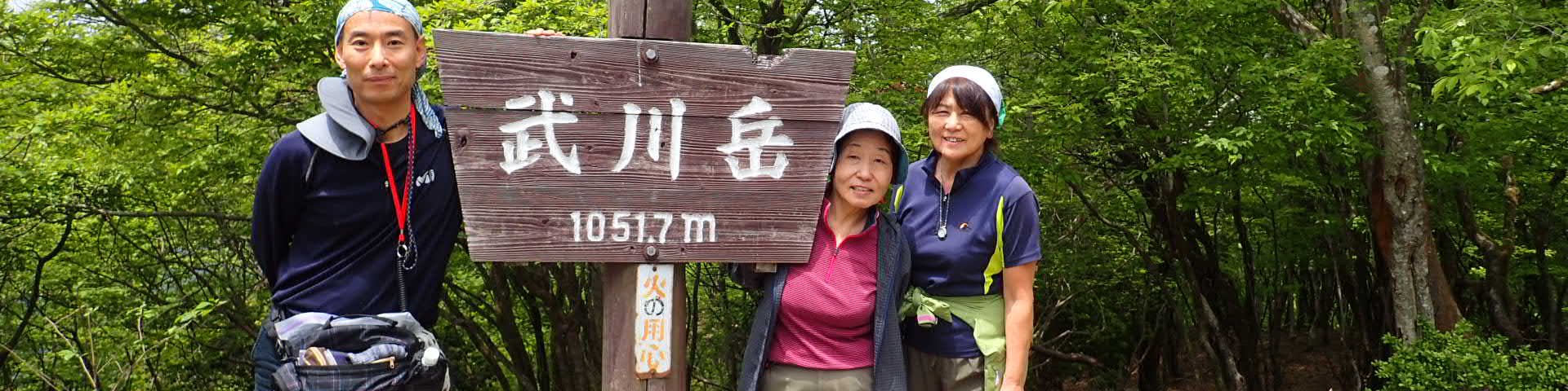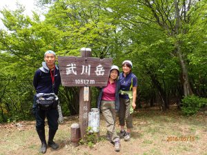 武川岳は、都県境に横たわる長沢背稜から、有間山稜に下り武甲山に至る長大な稜線上の大持山から派生する尾根上に位置する。古くは秩父では根古岳、ホウキ平と呼ばれていましたが、武甲山の「武」と生川の「川」をとって武川岳と呼ばれるようになったそうだ。武川岳の西には鎌倉往還である妻坂峠、東には秩父往還である山伏峠に挟まれる歴史的な要衝の地でもある。登山道は四方から集まっており、大持山との鞍部である妻坂峠、伊豆ヶ岳との鞍部である山伏峠、二子山と名栗を結ぶ縦走路が南北に走っている。今回は、生川上流の武甲御嶽神社の一の鳥居に車を止めて、少し下がった集落の脇からバリ尾根ルートを登って行った。バリエーションといっても、踏み跡は明確でテープ表示もしっかりしており、2時間程度で稜線にでることができ、静かで心地よい登りであった。武川岳の頂上でゆっくりと昼食を食べても、時間の余裕がありすぎたので、私が川原塚・I村両女史にお願いして、懸垂下降の練習をつけてもらった。そんなに急でない斜面で実施したが、聞くとみるとでは大違い、ATCを使ってやってみたが、つけるカラビナ一つとっても、自分で持って行ったものでは、小さい・形が悪い、等いろいろ勉強することがあるなぁと感じた。その後は。妻坂峠より一の鳥居まで下って行ったが、お二人は途中で山菜を取りながら、のんびりと下って行った。(記 O知)