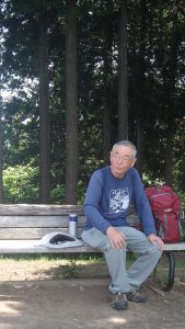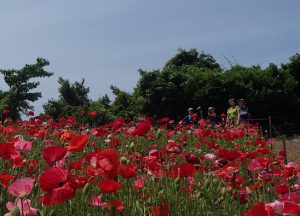 た牧草地からは、堂平山 や別名乳房山と呼ばれる笠山が望め る。程なくベンチのある眺望の良い 大霧山に到着。山頂からは公開ハイ キングで登った美の山や、これから 目指すポピー畑も確認できた。メン バーが持参した、線量計で放射線を 測定する。 私は実物をみるのは初めてである。 政府が山や登山道の放射線量の測定 を実施する意向がないため、労山が 放射能汚染マップを作製しているそ うだ。20 分程の休憩の後、記念撮影 をして山頂を後にし、粥新田峠に下 山する。 ここからは二本木峠方面へと車道 を歩きになる。展望が開けた分岐手 前に、放牧された乳牛が草を食んで いる。分岐から西側皆野方面に数百 メートル程進むと、丘陵帯一面に、 まだ満開とは言えないがポピーが咲 き乱れて、観光客の目を楽しませて くれる。花の周遊道から写真撮影し ながらダラダラと歩くが、これがか なり疲れた。 昼食後、そそくさと粥新田峠まで戻 り、橋場バス停までは約3.0 km。 予定より早い下山で、14 :00 台のバ スに間に合うか微妙なところだ。 リーダーは予定通りにゆっくり下 山で、山道を楽しもうと思うが、後 続2 人を残して先頭集団はひたすら 冷たい飲み物を求め、ドンドンと下 って行く。先頭集団の思惑通り14 : 30 には駅前で冷たい飲み物を供給 してくれる、お店探しをしていた。 この時間、飲食店は休憩時間なの に・・・ さすがと言うか目的達成のメ ンバーと、取りあえずは無