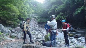 今まで水に濡れるのが苦手なのと、装備を揃えるのも大変という理由で沢は避けていました。しかし、Rちゃんより沢靴を譲り受け、Jちゃんよりお古の沢用ハーネスを頂き、これはもう神様がやれと言っているのかと(笑)。自分でも寒いのが嫌なのでスパッツや沢用の着衣もろもろ購入するなどして本番に備えました。みんな優しいなあ、大切に致します。ありがとう。それにしても、沢は全くの初体験。どんなものかもわからないのに大丈夫なのかとかなり不安を感じながらも眠りに就きました。