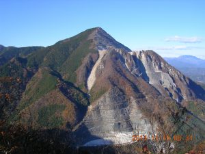 今回は、名実ともに秩父を象徴する武甲山から小持・大持山をめぐった。もともとは南方のサンゴ礁が起源となる石灰岩の山であり、どこをどう廻って今の秩父盆地にそびえるようになったのか、思いを巡らせると、非常に不思議な感じがする。武甲山の石灰岩は日本屈指の良質な大鉱床であり古くから漆喰の原料として採掘されてきたようだが、明治期よりセメントの原料として採掘が進められ。1940年(昭和15年)に秩父石灰工業が操業を開始して以降、山姿が変貌するほど大規模な採掘が進められ、とくに北斜面で山体の崩壊が著しい。石灰岩の採掘により旧山頂にあった縄文時代から近代までにいたる歴史のあった信仰遺跡、巨岩群は完全に消滅しているが、武甲の名は、日本武尊(ヤマトタケル)が、自らの甲(かぶと)をこの山の岩室に奉納したという伝説が元禄時代の頃から定着した。山行は武甲御嶽神社の一の鳥居から、表参道を登るところから始めた。武甲山の伏流水は平成の名水百選に選ばれているそうで、水の流れが非常に豊富で耳を楽しませてくれた。頂上まではさすが参道、道標等バラエティに富んだ道行きで、あれよあれよという間に2時間程度で到着した。御嶽神社にしっかりお参りをして、稜線を小持山に向かった。武甲山から小持山、大持山への稜線は「奥武蔵アルプス」と呼ばれているそうで、有間山稜から長沢背稜までつながっている。結構なアップダウンを繰り返し、大持山を過ぎると一気に下降して妻坂峠から一の鳥居までお昼には戻っていた。(記 O知)