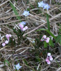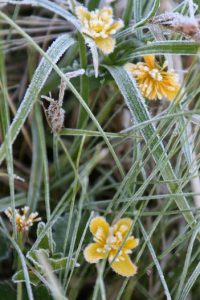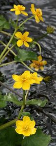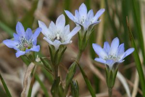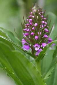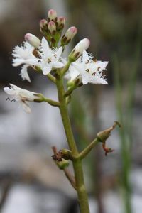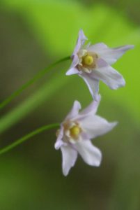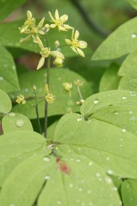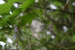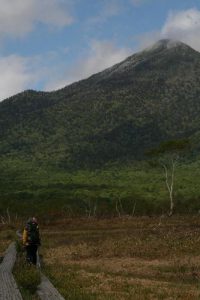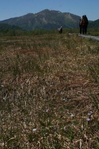 「春から初夏にかけ深山の雪の残る渓流沿いに清楚かつ妖艶な花が咲き競う」と図鑑で紹介されているメギ科の『戸隠升麻(トガクシショウマ)』を求めての山行である。戸隠升麻は戸隠草とも呼ばれ長野の戸隠で見つかったが、残念なことにそこでは戸隠森林公園で保護されているのみのようである。鳩待峠近くで同じくメギ科の山荷葉(サンカヨウ)が咲いている。更に山の鼻付近でもメギ科の葉が牡丹の葉に似ている類葉牡丹(ルイヨウボタン)も咲いているがハイカーは気付かないのか通り過ぎていく。他にも白根葵(シラネアオイ)や白山千鳥(ハクサンチドリ)、延根千鳥(ノビネチドリ)等も咲いている。6月の尾瀬の定番は『水芭蕉』だろうが、その水芭蕉の白い仏炎包は殆んど見当たらない。立金花(リュウキンカ)もあまり咲いておらず白く傷んでいる花弁も多い。Kkさんが以前来たときにたくさんあったという朱鷺草(トキソウ)等も行き帰りとも捜したがとうとう見つからなかった。立山竜胆(タテヤマリンドウ)はあちこちに咲き、蕾もたくさんある。姫石楠花(ヒメシャクナゲ)も咲いている。が、共に小さい花の上に木道もあり思った通りの被写体になってくれない。鈴蘭のような葉で蕾を着けた草もたくさんある。木道の整備のためかその草が倒れた辺りからはニンニク臭がプンプンするので行者大蒜(ギョウジャニンニク)と判る。登山道にも回りの山々にも雪は見当たらず至仏山にほんの少し残っているだけである。燧岳も雪は見当たらないが、頂上は雲に隠れている。が、雲が途切れると雪が降ったのか、霧氷が出来たのか白く見える。燧小屋でテント泊の手続きをする、その時の話では水芭蕉は2週間ほど早く咲いた上に遅霜の被害に合ってしまったと言う。お目当ての『戸隠升麻』も4、5日前に咲き終わってしまったという。でも、折角来たのだから自生地の葉だけでも見よう!と探しに行く。戸隠升麻と思われる実と葉を着けた株を幾つか見つけるが、やはり花はない。次回に期待を込めて、葉と実の写真を撮った。諦めて帰ろうと振り替えると、花を着けた一株が此方を見て微笑んでいる。薄紫色の目立たないが奥ゆかしいお嬢様のような花であった。テント泊の夜は寒かった。星空が見えるが、2年2ヶ月毎に地球に近づく火星は雲から出ると、すぐまた隠れてしまった。寒くてもう外に出る気になれない。朝方も冷える。霜は降っていないように見えたがこの日も大霜だった。三条の滝に歩き出すと蓮華躑躅(レンゲツツジ)や木々の葉に霜が着き綺麗である。が、帰りには蕾も花も霜害でシュンとなっている。沢を横切るときに戸隠升麻を探すが見つからない。両岸が崩れた感じはなく昨日咲いていた付近と雰囲気が異なっているように感じる。微妙な条件下で戸隠升麻は自生するのであろうか。帰りの尾瀬ヶ原は金曜日なのか旅行会社や学校等の団体も多く混雑している。だが、自然を感じないような急ぎ足のハイカーも多い。(記 TK)