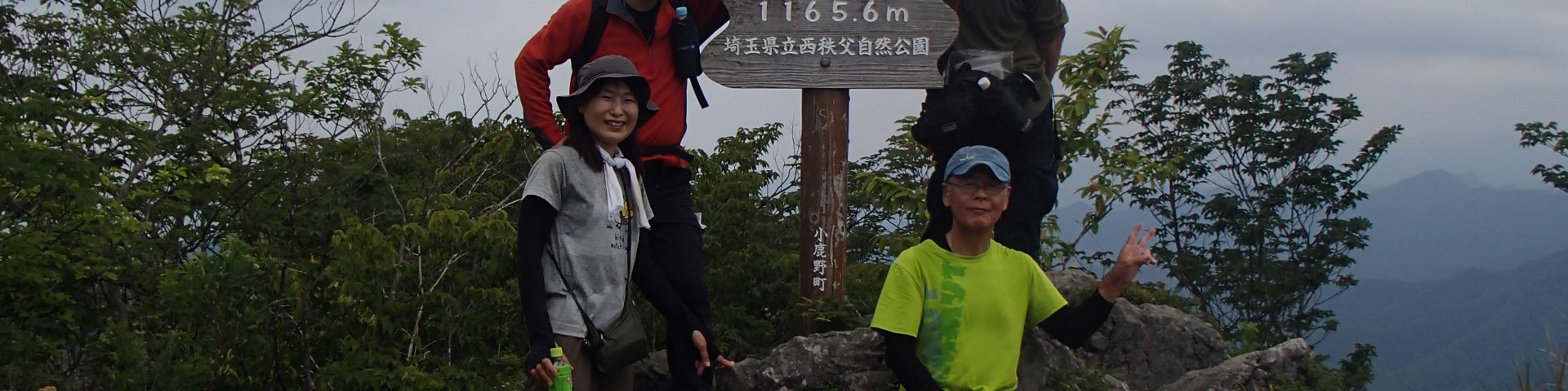 週間予報では雨だったが、良い方 に代わって梅雨の晴れ間、O知さん の車で川越駅発、下道をトコトコ走 り下山口の林道に駐車して行動開始。 今回は県境の尾根を登る計画なの で志賀坂峠まで車道を歩くことに、 O知さんを先頭に出発、国土地理院 の地図を見ながら登山道を探す、丁 度送電線が走っていて目印になり、 少し荒れた山道を登る。昭文社の地 図には載っていない登山道、どうし たものかと思いながら只管尾根道を すすむ、ただし東京電力の送電線が 尾根上に走っていて、それがヒント になってそれ程道迷いもせず何とか、 魚尾道分岐に辿りついた。 途中、O知さんから鉄塔にもいろ いろ種類があって御説明があった。 形も様々で1050ピークを横切る 鉄塔はまるで烏帽子のような形をし ていて勝手に「烏帽子鉄塔」と名付 けた。流石に専門化だけあって「二 本連なっているのは・・・・・・」 と説明は受けたが???。 分岐から先は普通の登山道になっ たが、南側から見る二子山西岳はま るでゴジラの背の如くギザギザな稜 線だ、気持ちを引き締めて、心も引 き締めて岩稜帯を登る、思った以上 にしっかりしたホールドがあり皆さ ん安定した登り。20分ほど登って 振り返ってみるとここまで進んでき た志賀坂峠からの尾根道を振り返る、 結構歩いてきた。 しかも1050mのピークから派 生した尾根道を辿って行くと、見る も無残な叶山の石灰岩が削られた山 並みがはっきり伺える。もうこれは 山ではない、昔誰からから聞いた、 二子山も石灰岩の採掘の危機のあっ たとか、一つ間違えると二子山も 武甲山の如く切り刻まれて山の形を 失っていたかもしれないと思うと、 恐ろしい。 気を取り直して岩稜帯を進み、1 2時半頃二子山西岳頂上に到着、ク ライミングでは何度も踏みしめた頂 上も尾根から登るとまた違った趣が ある、気になっていた50の山の責 任も果たし、ホッと一息ついた。 マッタリしながら昼食し、皆で記 念の写真をパチリ。 メンバーに恵まれ、楽しい二子山 でした。(塩D記)