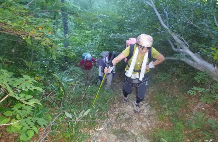 コースタイム:八海山屏風道登山口(5:25) =4 合目水場(9:05)=千本 槍小屋(10:00)=稜線 分岐(11:20) 新開道下降点(11:25)=水 場(13:40)=2 合目登山口 (15:40)