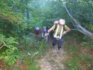 コースタイム:八海山屏風道登山口(5:25) =4 合目水場(9:05)=千本 槍小屋(10:00)=稜線 分岐(11:20) 新開道下降点(11:25)=水 場(13:40)=2 合目登山口 (15:40)