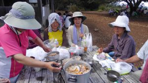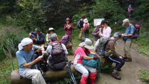 4カ月ほど歩いていなかったので 体力に自信がなく、入会してもなか なか山行に参加する機会を持てずに いました。今回、初参加させて頂き ました。棒の嶺は4回目となります。 前日まで雨模様の天気が続きまし たが、本日は久しぶりの晴天に恵ま れ、晴れやかな気分で迎えることが できました。L植山さんは沢の水量 を心配してなかなかコースを決めら れない様子でしたが、濡れれば済む ことで、沢コースに決まりました。 清M 常好さんがトップを担当し、2 番手に福D 美子さん、フォローの3 番手に私が入ることになった。 天気は良いが湿度は高く、涼しい はずの沢は風もなく蒸し暑い。水量 はあてずっぽうで倍くらいでしょう か。途中福D さんにシュリンゲを巻 いて確保することもあったが、無事 尾根道へ。時たまそよぐ風に涼しさ を感じながら、権次入峠、むき出し の樹木の根をかわしながら頂上に到 着。夏のアザミはそろそろ終わり、 ススキとアキアカネ。大気は水蒸気 に薄く覆われ日差しが熱く感じられ た 福 。 D さん夫妻が豚汁を用意してく れた。具だくさん、特に自家製のみ そは塩辛さを感じない。とてもうま い。ありがとうございました。 1時間半ほど山頂で過ごし、下山 となった。さわらびの湯駐車場に向 け、滝ノ平尾根コースを下る。W 部 さんが元気いっぱい、足取りも軽い。 清M 常好さんがトップを歩きながら も、時折後続に配慮する。K 端さん、 福D 利光さんも堅調。数名が途中か ら自分のペースで下り始め、岩茸石 で後続を待つ。露出した根の下り道 は長い。車にたどり着いたのは16 時頃となった。 久しぶりの天気に恵まれ、楽しい 一日でした。LU 村さん、メンバー の皆さんに感謝。 (阿B 記)