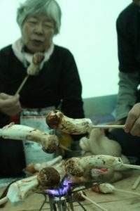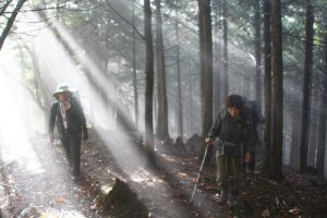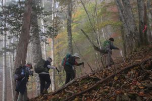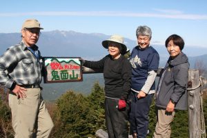 十月二十六日、二十七日と 二日間、日本のチロル「下栗 の里」を巡る旅と南アルプス 前衛の伊那山脈最高峰「鬼面 山」に登る目的で、出発した。 メンバーはTKさん、K原塚 さん、S々木雅枝さん、福D 二人。 一日目は、日本のチロル「下 栗の里、しらびそ高原」に向 かう。真っ赤なすずなりのリ ンゴの木を見ながら、車は走 る。その後「松茸」「松茸」と、 幟が、ハタハタと風になびき、 我々を呼んでいる。どうやら この地方は松茸が名物らしい。 「松茸」の季節、一生に一度 触ってみたい、食べてみたい、 うちに そんなおしゃべりをしている 「松茸を買って、今夜、 テントの中で食べようじゃな いか」という事になった。 「で も、高いよ」 「皆で割り勘すれ ば、安い」等々。車の中は大 騒ぎ。でも、いざとなると「こ の店は高そう、やめよう」等、 尻込みしてしまう。車はどん どん高度を上げ、山道に入る。 だんだん民家がなくなり、あ あ、やっぱり「松茸」は夢の 中か、と、あきらめかけてい ると、一軒小さな「道の駅」 に出会った。数台車が止まっ ていた。様子を見に私が代表 で店の中に入る。なんと、店 の中には、本物の松茸が、パ ック詰めにされ、並んでいた。 びっくりして、声も出ない。 皆もゾロゾロ車から下りてき た。大きいのやら、小さいの やら。驚くのは値段、安いの です。パックにシダの葉を敷 き七本入って「六〇〇〇円」 これなら、今夜全員に一本ず つ、余った二本は鍋の中に入 れようと、買う事に。他に、 「シ ョウゲンジ」 (六百円、 )パッ クにあふれんばかり大盛りの 「ヒラ茸」(三百円)を買う。 松茸を買った時は、胸が躍っ た。今年は雨が多く暖かかっ たので、松茸は大豊作なんだ そうだ。この夜のテントの中 は、 「松茸」で、大騒ぎ。松茸 を割り箸で串刺しにし、丸焼 き。松茸のよい香りがテント いっぱいにひろがった。今夜 は松茸、平茸、ショウゲンジ、 秋のきのこいっぱいの鍋、す ごい贅沢鍋です。一年に一回 だけの贅沢。お腹いっぱいに なって、早めのおやすみなさ い 昼間 。 はよい天気でしたが、 その夜、雨が降り始めた。夜 中に雨は止み、トイレに外に 出ると、交通事故のガラスの 破片の道路のようにキラキラ 輝く満天の星空。こんな夜空 を見たことがない。急に怖く なり、ゾクゾクと寒気がして、 伊那山脈最高峰鬼面山 テントの中は松茸で大騒 福 ぎ D すぐにテントの中に潜り込ん だ 翌日二十七日 。 はいよいよ楽 しみにしていた「鬼面山」。朝 からよい天気だ。ガイドブッ クを読むと「途中岩礫の急斜 面でやせた尾根上は手がかり もなく、ストックかピッケル があると重宝する」と、書い てあったので、どんなにか恐 ろしい所だろうと、ドキドキ。 登山口に三体のお地蔵様がい らした。手を合わせ「神様、 仏様」と拝んだ。最初からい きなりの急登。やせ尾根。木 の根っこが盛り上がり、尖が った岩、ザラザラの石で滑り やすい急登。また、半分、登 山道の土が落ち、崩壊してい るザレ場、全く谷底も見えな い。下から冷気が吹きあがり ガスがモアモアしてるだけ。 恐ろしい所だと速足で通り過 ぎる。登り始めから恐ろしい 登山道で、ガイドブックに出 てるこれ以上恐ろしい場所は いつ出てくるのか、心配ばか りしていた。ぐんぐん高度を 上げ後ろを振り返ると、遠く、 いや、近く、高く大きな山が 見えだしてきた。あれは、南 アルプス?恐ろしく高い。 ようやく穏やかな登りになり、 ブナの巨木が登山道脇に一列 に堂々と生え、とても立派だ。 標高一七〇〇mから一八〇 〇m辺りになると苔むした針 葉樹の森に変わった。緑の苔 が実に綺麗だ。可愛い森の精 が現れてきそうな気持のよい 場所。そしてさらに高度を上 げて登ると木々の間が狭くな り、登りつめると目の前がパ ッと開け、鬼面山山頂到着。 山頂には、郵便ポストと物 見櫓が建てられてあった。丸 太で作られ、古い櫓で腐って いた丸太もあった。皆、子供 みたいにはしゃぎながら梯子 を登っていった。 「ワすごい 景色だ」 「気持ちいい」「福D さん早く上がっておいでよ」 「私は高所恐怖症だから行か ない」 「南アルプスが良く見え るよ。中央アルプスもよく見 えるから、早く、早く」と言 われても、しばらくは下で、 抵抗していたが、上で、なん やかんやとうるさい。ついに、 垂直の八段はあったと思う木 の階段を一歩一歩上がってい った。暖かい空の上にとびだ した。真っ青な大空。三六〇 度の大パノラマがひろがった。 中央アルプスの千畳敷カール や宝剣岳、ホテルまで見えて いた。あの時は高山病にかか ってしまい、辛かったな。で も、来年の夏は木曾駒が岳に 登ってみたい。南アルプスは もう、一生、縁のない場所、 むなしい、と、思いながら、 ながめていた。 今日は我々だけの独占の山 と思っていたら、ひょっこり 一人の男性登山者が登ってき た。神奈川県から日帰りで来 たという。さっそく、カメラ をお願いしてしま