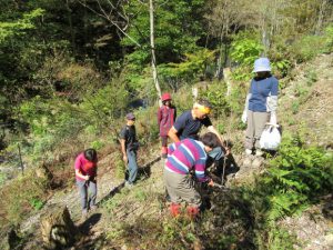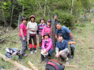 2015年10月3日、「労 山50周年記念植樹」で、50本 の苗木がたくさんの会員の手 によって武甲山に植えられま した。しかし、残念ながら枯 れたものがあり、その補植が 先日有志によって行われまし た。皆様、ご苦労様でした。 10月29日、秋晴れの空が 広がった。いつもの通り、駐車 場に集合、車に分乗して、登山 口駐車場へ。 荷を分けて10時30分出発。 最初の沢の橋が流されているが、 通過にさほどの困難はない。し ばらく歩いて沢を対岸に渡り、 また渡り返すと間もなく目的地。 故Y本さんの奥さん、章子さん も特に不安はなく、12時前に 着いた。 植樹グループは、枯れた樹を 探す。1本は見つかったが、5 本はあったはずの残りが見つか らない。下草刈りの時枯れたと 思っていた樹は、実は枯れてい なくて、芽を出していたのだ。 それで、4本はクワンタイなし で植えた。 その間食事つくりグループは すき焼きつくり。酒がないのが 寂しい。その分、コーヒーと山 本さん差し入れのケーキで満足。 無事捕植を完了しました。 (O野記)