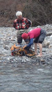 12月23日未明、Y城さんとH谷川さんが自宅まで迎えに来てくれる。北坂戸で塩Dさんを乗せ、全員終結、戸台を目指した。順調に走り9時頃戸台河原の駐車場に着いた。荷物を分け、出発、天気は曇。林道はすぐ消えて、戸台川の河原に付けられた赤布を頼りに進む。少し進むと、遠くに10人位の先行パーティが停滞している。近づくと流れが行く手を遮っていた。渡渉だ。彼らが渡った。Y城さんと塩Dさんは靴を履いたまま何とか渡る。私は、靴の中に水が入る危険があったので、決心して靴を脱ぎ、裸足で渡った。5mくらいの距離だが、くるぶし上までの雪解け水は冷たく辛かった。H谷川さんも私に倣った。このあと3回同じような渡渉があり、Y城さんは靴の中をわずかに濡らし、塩Dさんも靴を脱ぐ羽目になった。以前有った林道は、大雨で寸断されていたのだ。その上に、前日の雨で増水、それで想定外の渡渉というわけだ。河原の道も尽き、左岸の平坦な道を辿る。雪が降ってきた。丹渓山荘には13時頃到着。予定時間を大きくオーバーだ。ここから登り道、北沢峠を目指す。困難はないが、重荷で、はかどらない。夕暮れも近づき、峠を諦め、途中の林道上にテントを張った。こんな筈ではとの思いはあったが、テントに入ればそれも楽しい話題となる。