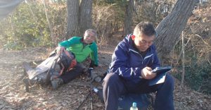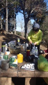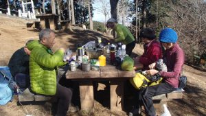 山頂は元日にふさわしい日本晴れ。野菜もお肉もたっぷりの水炊きは少しのアルコールと共に解放された気分にしてくれる。I村さんが持ち帰ったフランスワインを飲みながら去年登った岩や山、大宮労山のあれこれ、私たちの健康問題、今年の行きたい山や岩などなど、話は尽きない。食事の後はやはりI村さんが用意してくれたコーヒーを頂く。サイフォン式とエスプレッソの器具とそれ用に挽いた豆と共に。なかなかおしゃれな演出である。厳しい山行もいいが、お正月はこんな素敵な山行もいい。それも気心の知れた労山の山仲間がいればこそ。帰路はもと来た道を戻る。途中の拓大分岐で道を間違えそうになり、気分を正してしっかり歩く。山頂でたっぷり2時間はのんびりしたので、駅の外トイレは既に閉まっていた。JRの高尾駅で途中下車して、駅前の蕎麦屋で飲みなおし。