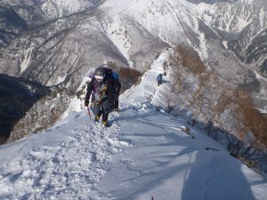 今回天気に恵まれ、雪も多くなくラッセルがなかった。トレースもしっかり付き、ナイフリッジの箇所も雪庇が張り出しナイフになっていなかった。好条件だったので厳しく感じない楽しい山行になったが、「こんな好条件ばかりじゃないぞ」と自分に言い聞かせ、これからも山に向き合いたいと思っている。
