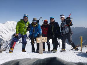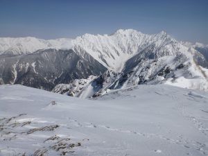 倒木をくぐり抜けたり、急斜面をトラバースしたり汗だくになりながらも、あっという間に1950mのテント場に到着。頂上まで行けそうな時間なので行くか検討するが、天気も悪いので今日はここまで。1時間かけて快適なテントを設営し、長~い宴会が始まる。大きなテントで良かったね!いくつかのパーティがテントの横を通り下山して行った。聞くと頂上からは何も見えなかったとのこと。夕方からの雪が降り続いている。明日に備え早めに就寝。3/20(月)起きたときは風が強かったが、天気も回復し登山日和となる。ハーネスとメットを着け出発。今日も急登が続く。上部には3張りのテントが張られていたが、小さいテントでないと無理。だんだん乗鞍や、煙を出した焼岳、穂高の展望も見えてきた。いよいよ2520m付近の岩稜帯に到着。フィックスロープがあり、ホールド、スタンスもあるので難なく乗り越すことができた。後はなだらかで広い尾根を歩いて頂上に到着。途中風もあったが、頂上は快晴無風。そして、360度の絶景! 目の前に広がる穂高の山並み、笠ヶ岳、焼岳、乗鞍岳、御嶽山、もうサイコー!